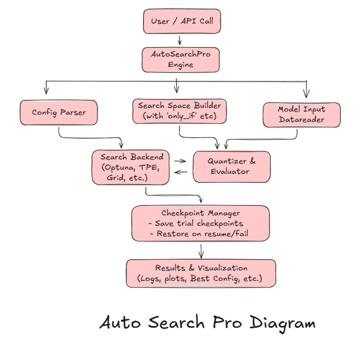 The search space defines the set of possible configurations that Auto Search Pro can explore. It is the heart of the optimization process and it support: Hierarchical structure: parameters grouped under different parts like ‘weight’, ‘weight_params’, ‘activation’, ‘activation_params’, ‘algorithms’ etc. Conditional selection(‘only_if’): parameters only activate if certain conditions are met to avoid invalid search space. Extensibility: Easy to plug in new models, algorithms, and settings. Dict-based config: Configuration is centralized in Python dictionaries (instead of YAML/JSON) for flexibility and programmatic control.