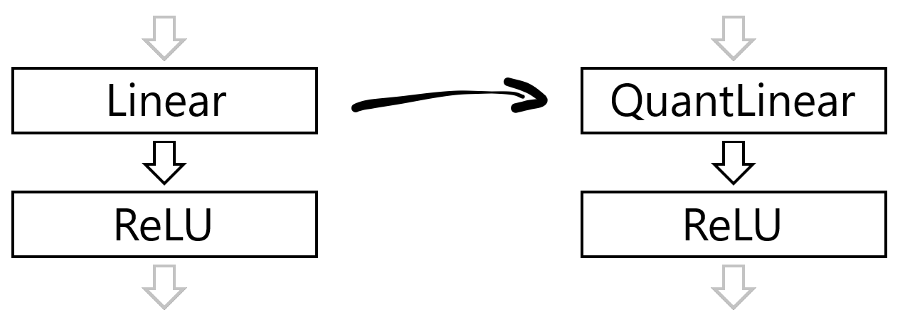 When Quark encounters either of these layer types, it substitutes them with a Quant version, such as QuantLinear or QuantConv2d.