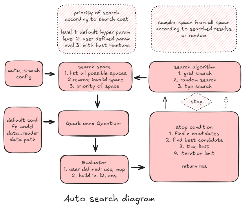 To use the automatic search process for model quantization, you need to define the following:- Auto Search Config: This includes parameters like the number of iterations, expected time per configuration, tolerance levels, and the stop condition.- Quantization Config: Defines the quantization method, such as bit width, layer-wise quantization, and rounding methods.- Evaluator: If using a custom evaluator, provide the test dataset and evaluation metric. Otherwise, the built-in evaluator will be used.- Float Onnx Model: This model is the target model to be quantized.- DataReader: Defines the calibration dataset for model quantization.
