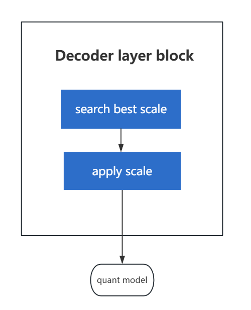 As illustrated in the figure, the AWQ algorithm first identifies the decoder layers from the model structure. It then processes each block individually: for every block, the algorithm is divided into two phases — the search-best-scale phase and the apply-scale phase: