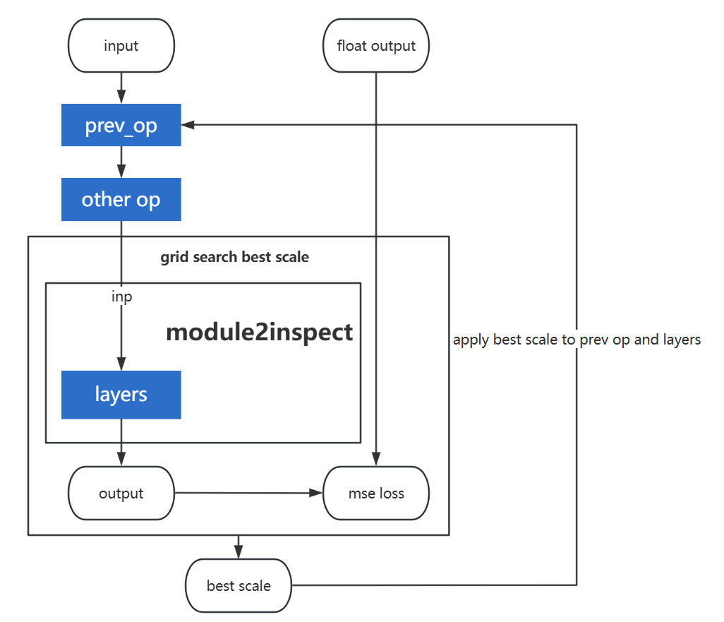 module2inspectis the minimal module for adjustment in the AWQ algorithm. We perform a grid search to compare the MSE loss between the quantized output and the float output, identify the scale that minimizes the loss as the optimal scale, and then, during the apply-scale phase, integrate this scale into the weights of the preceding operation and the layers.