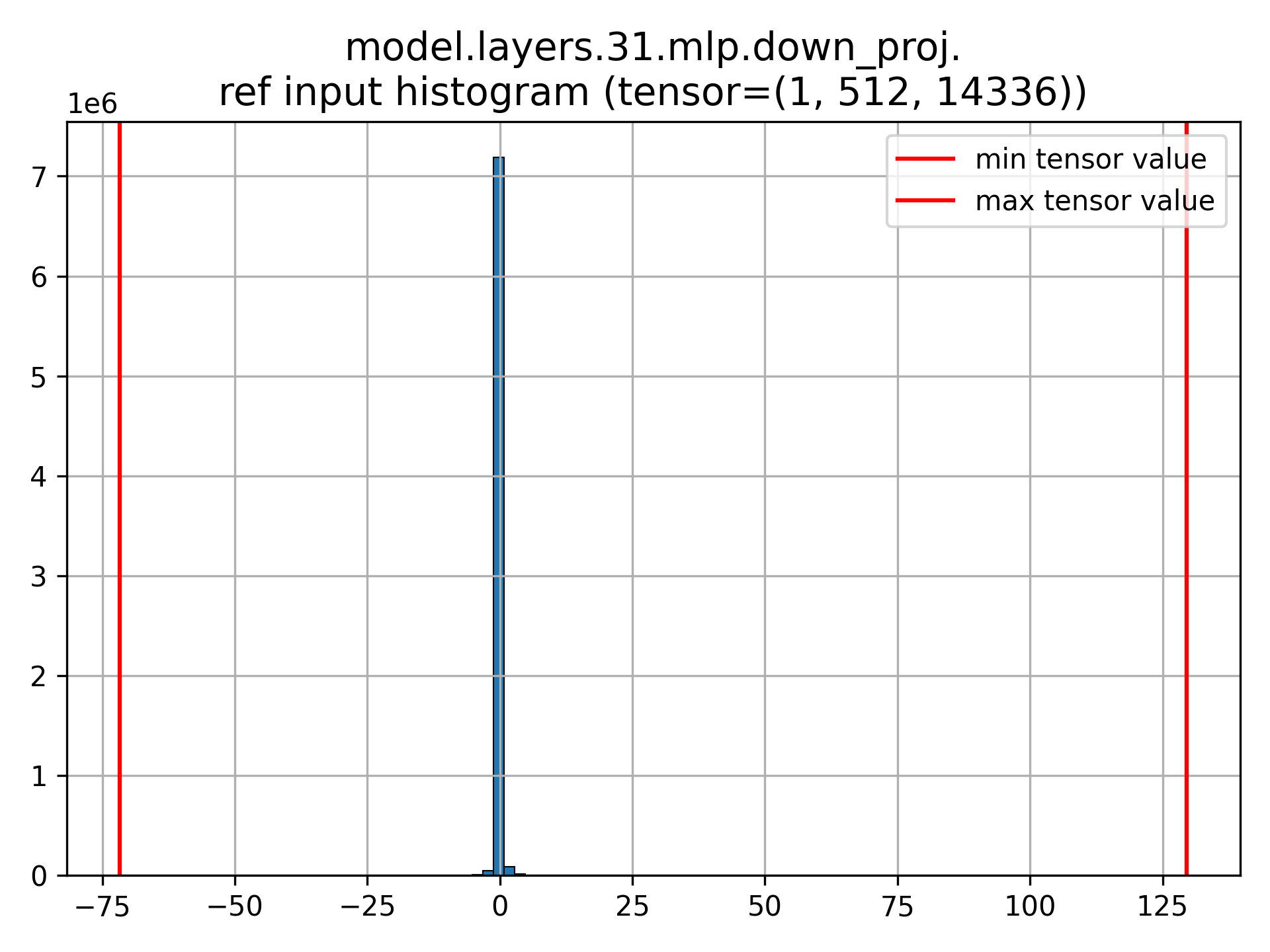 model.layers.31.mlp.down_proj reference (non-quantized) input distribution. We see a very large range of values.#